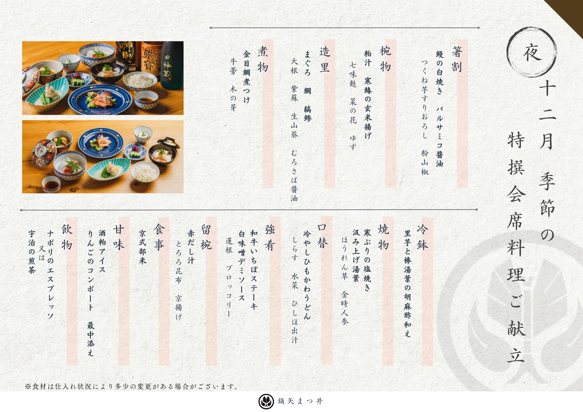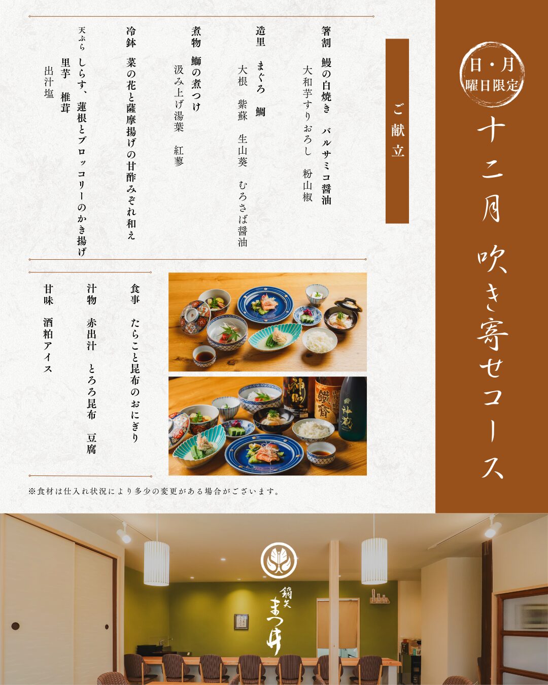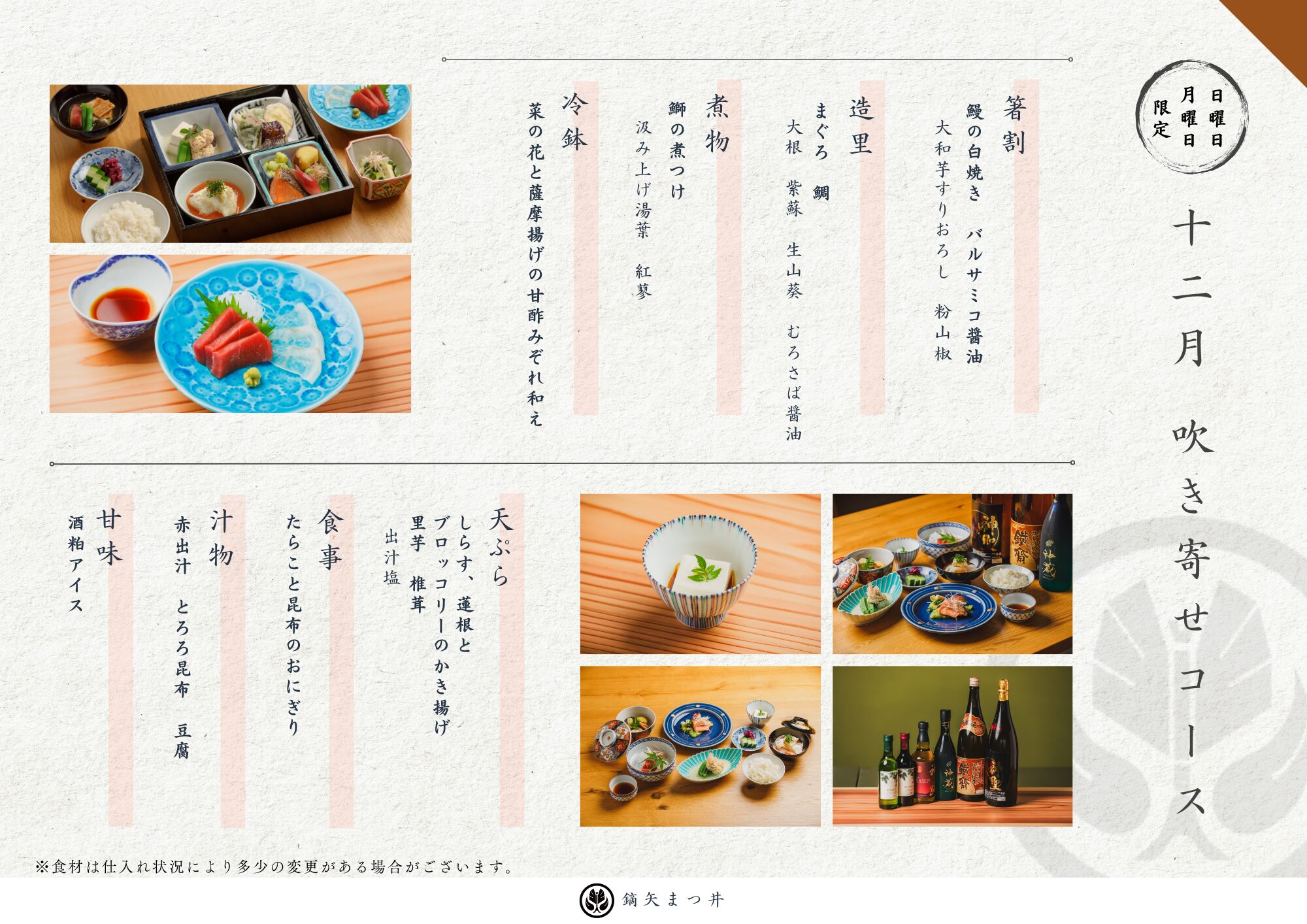 お昼のコース 3,650円(税込) カジュアルな雰囲気とお値段で当店の味をお試し頂ける松花堂会席膳。 季節の食材と日本料理の味付けに加え、時には店主が暮らした10ヵ国のエッセンスが盛り込まれた遊び心のある一品もお楽しみ下さい。 夜のコース 13,750円(税込) 旬の食材をふんだんに使った繊細で奥深い味を通じて四季の美しさや季節の移ろいを感じていただける会席料理。 とは言え堅苦しいルールはございません。お好きなお飲み物と一緒にゆっくりとお料理をご堪能下さい。 夜の特撰コース 19,800円(税込) 吹き寄せコース 8,250円(税込) 日・月曜日(ご夕食)限定のお得な「吹き寄せコース」です。 お得に季節の料理をお楽しみください。 ご予約はこちら