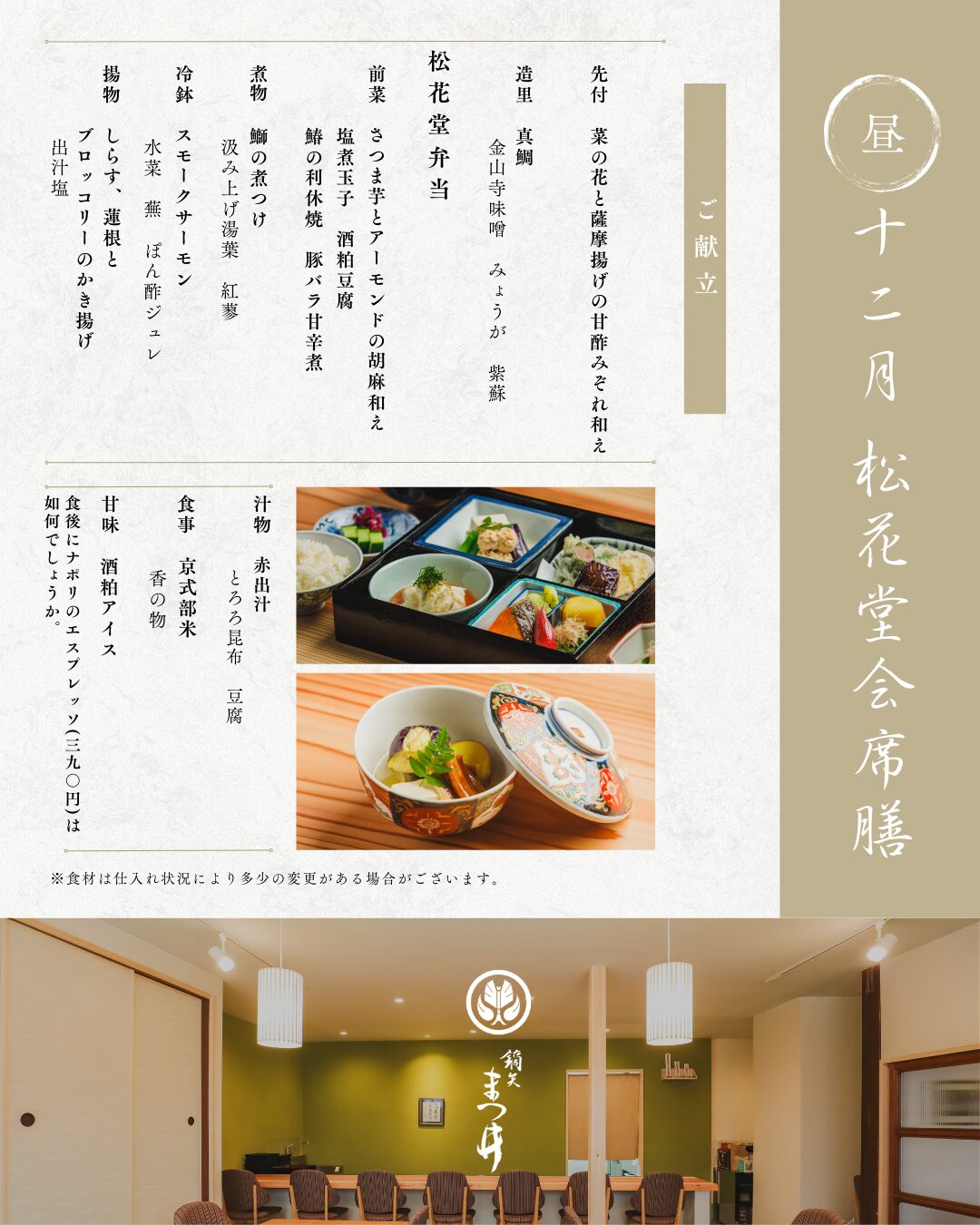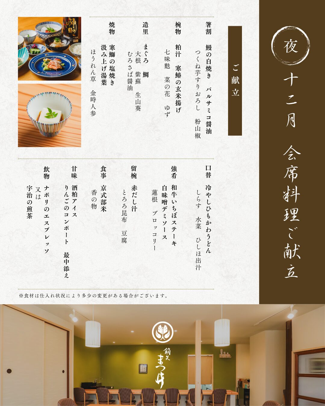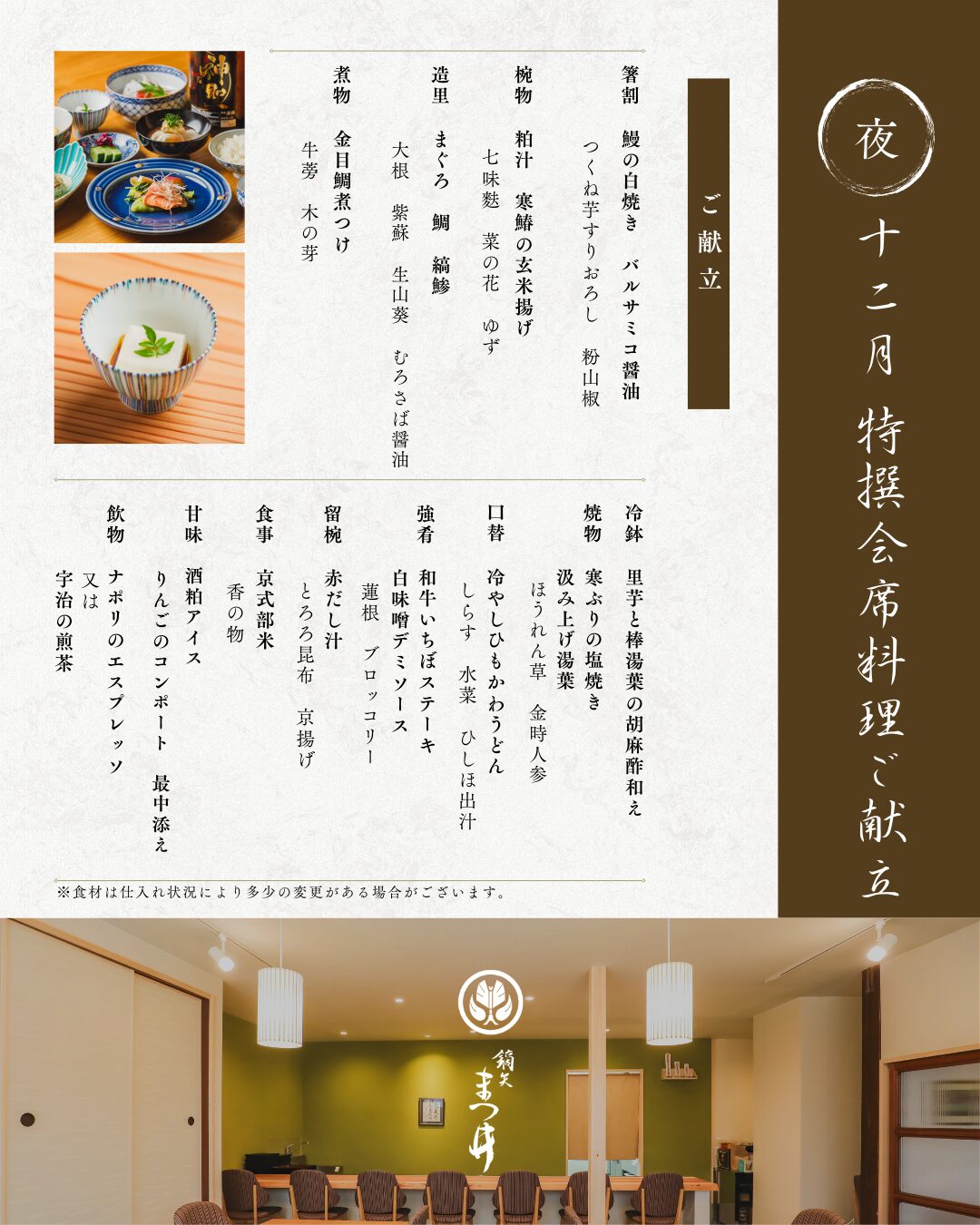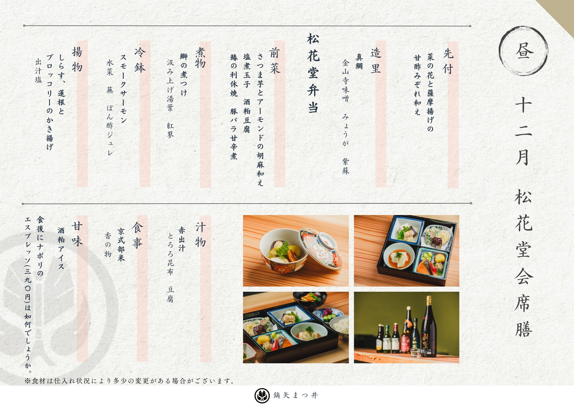 お昼のコース 3,650円(税込) カジュアルな雰囲気とお値段で当店の味をお試し頂ける松花堂会席膳。 季節の食材と日本料理の味付けに加え、時には店主が暮らした10ヵ国のエッセンスが盛り込まれた遊び心のある一品もお楽しみ下さい。 夜のコース 13,750円(税込) 旬の食材をふんだんに使った繊細で奥深い味を通じて四季の美しさや季節の移ろいを感じていただける会席料理。 とは言え堅苦しいルールはございません。お好きなお飲み物と一緒にゆっくりとお料理をご堪能下さい。 夜の特撰コース 19,800円(税込) 吹き寄せコース 8,250円(税込) 日・月曜日(ご夕食)限定のお得な「吹き寄せコース」です。 お得に季節の料理をお楽しみください。 ご予約はこちら